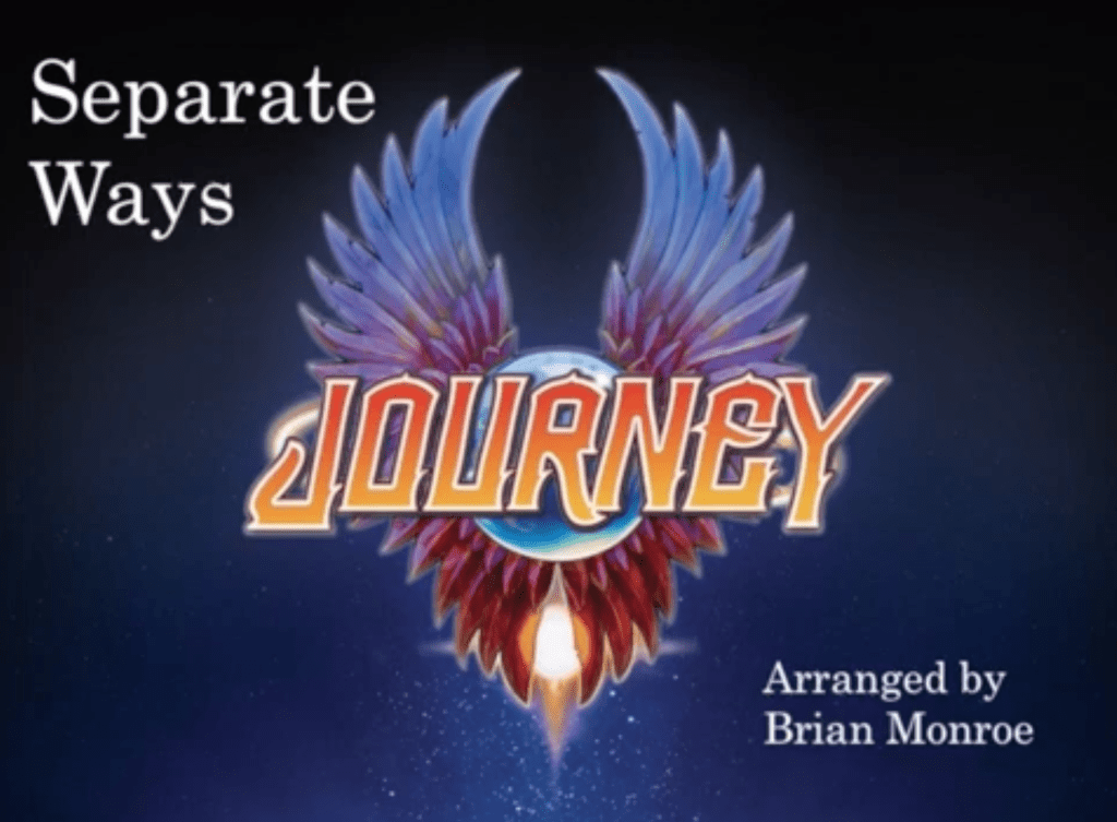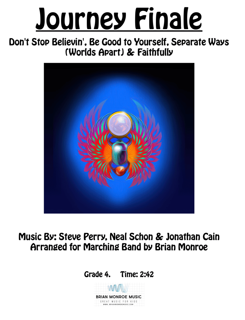 Journey Finale is a medley of Don’t Stop Believin‘ with Be Good To Yourself, Separate Ways (Worlds Apart), and Faithfully arranged for Marching Band by Brian Monroe at the grade 4 level. Opportunities for solos arise from Trombone and Trumpet players. This arrangement makes a great compliment to Monroe’s arrangement of Separate Ways (Worlds Apart) also published through this publisher and make a great Finale for your Journey themed show. Length of the music is 2:42 with Tempos ranging from 126 to 160. Available from Sheet Music Direct and Sheet Music Plus!